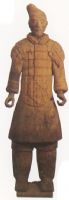 泥質灰陶,胎質堅硬。此俑立於方形台座之上。頭頂挽髻,戴一圆帽,圆臉,雙目炯炯有神。身着戰袍,披鎧甲,雙手作執物狀,足穿方口翘頭鞋。此俑形體高於真人,身材魁梧,體魄健壮,通過對武士形體、面部表情的刻劃,成功地塑造出一個年轻英俊的武士形象。