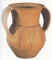 泥質橙色陶。喇叭口,高颈,鼓腹,平底。颈腹間置對稱带状耳,耳鏤雕有三角纹和圆點纹。颈腹交界處繪有一圈紅彩弦纹,其下繪三層倒三角紋。
