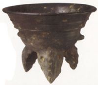 胎中央细砂。器身作盆状,輪制成型,施有黑陶衣。壓磨光滑,漆黑發亮。器底連接三個鳥頭形足,手工塑就。足呈等腰三角形,足面上鼓下凹,以附加堆紋作豎鼻,兩侧有凹陷的眼眶,足下部内彎呈鳥嘴形。