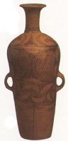 泥質红陶。喇叭形口,直颈,圆肩,長圆腹,平底。腹中部設對稱雙耳。器以黑彩装饰,肩部為波浪紋,上腹部饰相對的半圆形網紋,其下繪水涡紋。