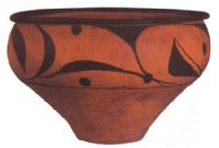 泥質红陶。斂口,圆唇,宽沿,腹上部外鼓,下部内收,平底。器打磨光滑,饰黑色彩繪。口沿满饰黑彩,上腹部繪勾葉纹,葉紋間空隙點綴有黑彩圓點。