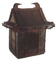 泥質灰陶,房屋模型,面闊三間,進深三間,正面中間開門。其餘三間為實榻大門。房屋斗拱、挑拱、正脊、瓦脊等建築構件雕塑的非常逼真。通體以白粉為底,其上施紅、藍、黃等彩繪。
