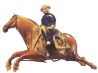 馬作奔驰状,四蹄腾空飛奔,馬昂首伸颈,剪髻缚尾,辔饰、鞍鞴俱全。鞍上坐一骑俑,面带微笑,身穿長袍,雙臂前伸做持韁状。胎呈白色,馬施红赭、黄色釉,俑衣為蓝色,雖為出土物,但色彩絢麗,釉色光亮。