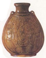 壺體呈扁圆形,腹部兩面饰“胡腾舞"圖案,五人正在樂舞,為胡人形象。胎體白色,通體施橘黄色釉,釉色鮮艷。此壺造型新颖別致,紋飾清晰。此壺出土於紀年墓,為北齊陶器中的精品。