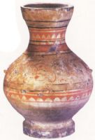泥質灰陶。敞口,束颈,鼓腹,平底。腹兩侧有雙獸頭。外壁白粉凃地,施红、黑彩繪紋,腹部為狩獵纹,兩人骑於馬上正在追捕猛虎和野牛,其間還繪有梅花鹿、大雁及祥雲。