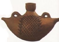 泥質紅陶。器作船形,肩有雙鈕以供穿繫。腹壁兩面以赭黑彩繪出網纹。此器造型罕見,保存完好,是仰韶文化的藝術珍品。