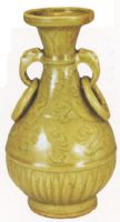 淺盤口,長颈,圆鼓腹,圈足。以象首銜環雙耳為特徵,腹部饰以刻花花卉纹,上下儭以蕉葉和菊瓣紋,中以帶状弦纹相隔。通體施青釉。