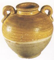 圆唇,短頸,圆肩,鼓腹,餅足。肩兩侧安置復式雙繫。灰白胎,胎質粗。腹中部以上施白色化妆土,上腹施黄釉,有細碎開片,罐内蕩釉。此罐出土於鹿泉市北新城唐晚期至五代墓群,其形制和施釉特點舆石家莊市趙陵鋪唐墓所出雙耳粗瓷罐相同,應為唐代之遺物。