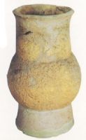 紅陶。敞口,直颈,圆鼓腹,高圈足。腹饰一道凸弦紋。