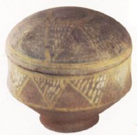 泥質灰陶。圆鼓顶盖,盒口微斂,深腹,外壁有折棱,圜底,矮圈足。盖與腹身的上部即折棱以上满施红、白、黄三色彩繪圖案,用黄彩繪出連續的三角形框,内填繪红色或白色的斜點紋,似雨滴。盖頂中心為一黄色的圆環,内繪红白相間的重環纹,加之輪製痕跡明顯,形成了黃白紅三色漩渦狀紋心。
