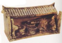 房為單簷硬山式质,前後簷面上刻劃瓦壟状。房面闊三間,進深一間,前面全開,其餘三面有牆。屋内左右兩端各有一人,左邊一人立於一碓春後執碓春米,右邊一人操作磨盤;房中間放有一簸箕和兩個小臼。
