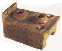 泥質红陶,上施黄釉。竈的平面為長方形,中空,前端略宽,有長方形落地火门,上有梯形擋火牆。竈面有二大二小四個火眼,在兩個大的眼上各置一釜。竈的後端有高约二點七厘米的竈牆,牆上塑出煙道。