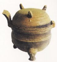 灰陶。子母口,深腹,平底,下腹饰獸蹄形三足。口兩侧附耳高翘,耳根突出,腹中部有凸棱。盖满釉,釉色青黄,器身上部施釉,大部分已脱落。