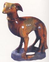狗尖嘴平顶,雙耳垂後,雙眼圆睜,平視前方。腰细,長尾下垂,四肢较细。施黄褐色釉。