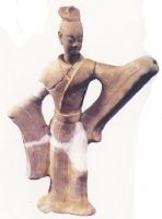 泥質灰陶,表面施白色陶衣,上凃红彩,頭身分製。頸部留出空心,後将頭部插入。舞俑頭戴小冠,身着右衽廣袖衫,下着長裙,腰繫带,衣衫和長裙均凃红彩。