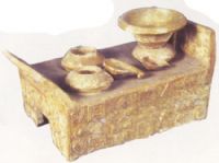 泥質紅褐陶,外施黄褐色釉,器型、釉色都很豐富。竈呈長方形,竈頭有火門,上有斜坡状遮,簷,竈頂安置三鍋,竈尾有豎牆,牆上塑出折曲的煙道。竈四壁等處均饰幾何形圖案。