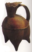 泥質白陶。敞口,细長颈,扁带形鋬,三袋状足,腹中部有锯齿形堆纹一周,陶胎薄而細腻。