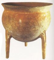 夾砂紅陶,手制。侈口,宽折沿,鼓腹,圜底,圆柱足。素面。足腹黏接處有捺窩,足根部正面有一壓印的凹槽。此器應為炊飲器。