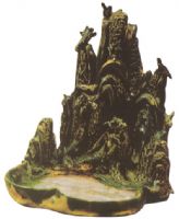 胎呈白色。水池為海棠形,水池一邊堆塑一座高山,山峯高聋,山势起伏陡峭,高低錯落有致,山間有雲朵和小鳥。小鳥有的在歇息,有的在池旁飲水。通體施綠、白、黄等釉彩,以綠釉為主。