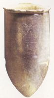 夾砂灰陶。侈沿,直口,筒形深腹,尖圜底。腹上部刻有“凸”,為圖像文字。此器為泥條盤築法手制而成,胎質坚硬,反映出大汶口文化较高的陶器製作和烧造水平。