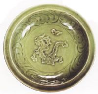 此盤以單龍戲珠纹為主题,周邊環帶状雲氣纹,展现單龍戲珠於雲氣之同,形象生動。豆青釉是青釉中的一種,我國名窑均有烧裂。龍纹瓷器一般應屬皇宫用品。