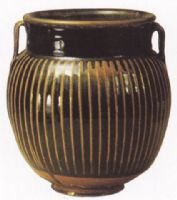 直口,捲沿,直鞭,圆頸,圈足。腹部饰凸起的平行豎線紋,線呈白色。頸肩部塑有對稱的蕖形雙繁,其上刻劃葉纹樣。器內施酱色釉,器外為黑釉。白線纹装饰的瓷器為山柬、河南一带所產,具有较强的地方特色。