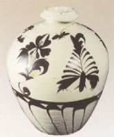 侈口,圆唇,折沿下斜,短束颈,溜肩,鼓腹,下腹斜收,圈足。灰白胎,質较粗。釉色白中泛黄。白釉繪黑彩,肩部圆案為三株折枝草葉間繪三朵花卉,花葉間填饰三雙飛蝶,下腹部滿飾菊瓣紋。白釉黑花是磁州窰瓷器罪流形的一種裝飾手法。