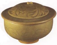 直口,深腹,圓足,蓋頂供起,上有一圓鍋形小鈕,寬蓋緣,下有一子母口。蓋與缸外壁剔花卉。蓋內壁和底圈足無釉,瓷胎堅細,呈淡紅土色,青釉較厚,略類黃褐色,有細小開片,色澤較好。
