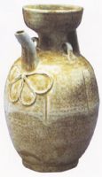 杯形口,直颈,溜肩,長圆形瓜棱腹,圈足。前嘴後把,兩邊置繫。壺嘴下方贴蝴蝶形花纹,此装饰為整件器物起到畫龍點睛的作用,增加了壺的美感。