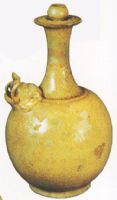 盤口,細長頸,圓腹,盂式鈕,鈕座飾菊紋。肩部為象首流,彎曲的長牙褐昂器的鼻子,十分生動。軍特在唐代痕流行,此器的出土證明,至少在隋代已出現此類器。
