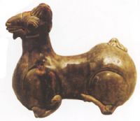 器呈卧羊状,昂首,目光馴服溫順,雙角繞於耳前,頭顶有一圆孔,用以插燭支架。四足捲附腹下,臀部上端贴印短尾。胎灰白,施青釉,眼睛、耳朵、肌肉突出部點有褐彩。此器造型精巧,比例均稱,釉色晶瑩潤澤,為越窰青瓷早期作品,製作稍粗糙。