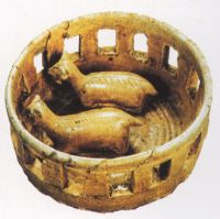 圈欄呈圆形,壁鏤方孔,欄內塑兩雙卧伏状山羊,雨眼急切地注視着前方,似乎是在盼望主人放牧。内外施青釉,呈黄绿色,釉面光亮。此器圈欄有多處破損。