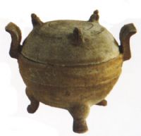 子母口,口侧有高於鼎蓋的長方形鏤空雙耳,耳上部外撇,耳面饰獸纹。深腹,腹中有折棱一道。圓底,下置三獸足。此器為仿青銅鼎模羊燒造,造型古樸典雅,藝術性豐富。是西漢時期婺州窰的原始瓷的代表作。