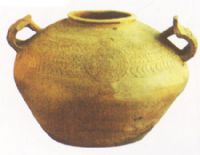 小口平沿,矮颈,斜宽肩,鼓腹,下收成平底。屑部設兩宽带状横耳,其上刻割武士形象。肩部飾弦弦纹四组,其開饰以人字篦點紋。舆耳垂直的瓿身雨侧凸印玉璧形纹饰,璧上端鹅人面形象。器施青褐色釉,釉不及底。此器造型完美,形制較少,紋樣新穎別致,較為常見。