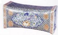 枕作長方形,枕四面锦纹為地,一面菱形開光肉繪螭龍莲花纹,一面墨彩篆書题為對聯一幅及铭记“丙申巧月卞丹主人题”。此枕形體较大,彩繪極為精緻,花紋繁縟,飾彩艷麗,且有明確紀年,為康熙后期彩瓷器的精品。