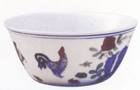 撇口,斜壁,卧足。内壁白釉,外壁門彩纹饰,繪五雙大小不同的子母雞及花卉山石紋。底内青花楷書“大明成化年裂"款