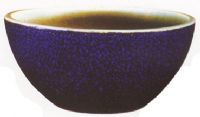 敝口,弧壁,圈足。内壁施白釉,外壁為灑蓝釉。内底心青花雙圈書“大明宣德年制”款。