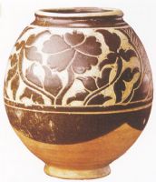 罐腹部饰褐釉剔花折枝牡丹纹,剔花技法筒練、撲拙自然,構圖圓满、線條流惕,胎體厚重,胎質较粗,為西夏靈式窑的產品。西夏以此项羌族為主體建立的政權,經濟生活以畜牧業為麴主。