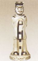 俑束髪戴冠,身著圓領廣袖衣,足登云頭翹靴,雙手拱於胸前,按劍立於圓形蓮座上。通體施白釉,間施黑彩。此俑形體高大人物形象生動,神情自若,為隋代雕塑藝術的珍品。