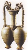 器單頸雙腹,飾有捏塑雙龍形柄,龍頭探入瓶口。通體施白釉。瓶底刻有“此傳瓶有口”,可知此器名為“傳瓶”。此器造型獨特,製作精緻,胎系質堅,有質溫潤潔白,表現出隋代白瓷的佳作。