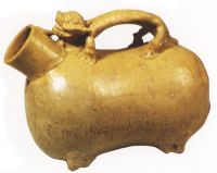 器呈卧兽状,通體渾圓,提梁呈兽形,腹部刻有“赤鸟十四年會稽虞师袁宜作”通体施青釉.青瓷虎子为南方三国,两晋,南北朝时期墓葬中常见的随葬品之一 .