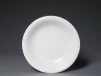 盘撇口,浅腹,圈足。胎体厚重。通体施白釉。盘心刻牡丹花纹。