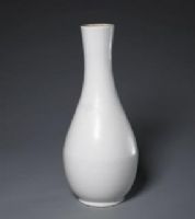 瓶呈悬胆式。小口,细长颈,鼓腹,圈足。圈足内无釉。无款识。通体施白釉,釉面莹亮。腹部暗刻花纹,刀法自然流畅。