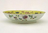 盘撇口,浅腹外弧,圈足。口描金彩,内外皆以粉彩装饰。盘内黄釉地上绘六个描金团寿字,每个寿字围以五只蝙蝠,折枝桃及万字飘带纹穿插于各组图案间,取“五蝠捧寿”、“万福万寿”之意。外壁白釉地上饰三组折枝花。外底红彩书“同治年制”四字楷书款。