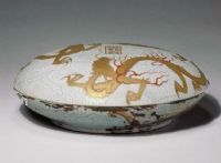 印盒扁圆形,子母口,圈足。盖面及器壁淡描青花祥云纹为地,其上各绘两条金彩五爪行龙飞腾于云海之间。底足内施白釉,书“大清嘉庆年制”青花三行六字篆书款。盒盖面正中金彩方框内署“懋勤殿”金彩三字。