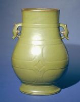 “牺”指的是古代供宗庙祭祀用的毛色纯一的牲畜,这个尊的双耳就是仿造的“牺”的形状。茶叶末釉是厂官釉中的一种。厂官釉属于铁、镁结晶釉,由于烧成工艺的某些差异,其色调有多种变化,有的似鳝鱼腹际色,俗称“鳝鱼黄”,有的像茶叶研成的细末之色,俗称“茶叶末”。此尊上的釉即可称作茶叶末釉。