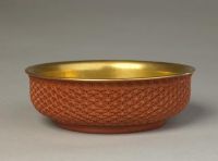 碗撇口,弧壁,圈足,玉璧底。碗里满饰金彩。外壁施红釉,仿雕漆工艺,口沿剔刻一周回纹,腹部刻排列有序的锦纹,近足处刻莲瓣纹,底红釉无款。
