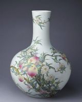 乾隆时期的粉彩瓷器中有大量祥瑞题材的装饰,这类题材大都借助自然景物寓意吉祥。绘画工细、层次清晰、内容繁缛是其时代特点。此瓶运用渲染手法绘画桃实,桃实饰彩浓厚,成功地表现出成熟桃实的娇艳色彩,构图疏密有致,形成叶有阴阳向背、树有老枝新芽的效果,是乾隆粉彩大件器物的代表作品。