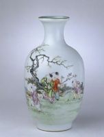 瓶撇口,细颈,椭圆形腹部,圈足。通体在白釉上饰粉彩绘一群眉清目秀、雪白粉嫩的小童敲锣打鼓、燃放爆竹的节庆嬉戏景象。口、足边描饰金釉,瓶内壁施绿釉,底绿釉上蓝料彩双方栏内书“大清乾隆年制”六字篆书款。