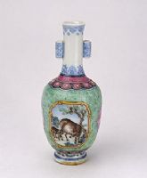瓶小口微敞,长颈,溜肩,椭圆腹,圈足外撇,颈部饰双贯耳。口、颈及双贯耳绘蓝彩卷草纹,肩部绘一周紫红地莲瓣纹,腹部以绿彩卷枝纹为地间饰四开光。一组开光为椭圆形,内以珐琅彩绘骑牛牧童和母子牛;另一组开光为圆形,内以胭脂彩绘山水风景,表现高山村舍、老翁独钓。圈足外墙绘一周变形如意纹。外底蓝料彩署“乾隆年制”双行四字楷书款。